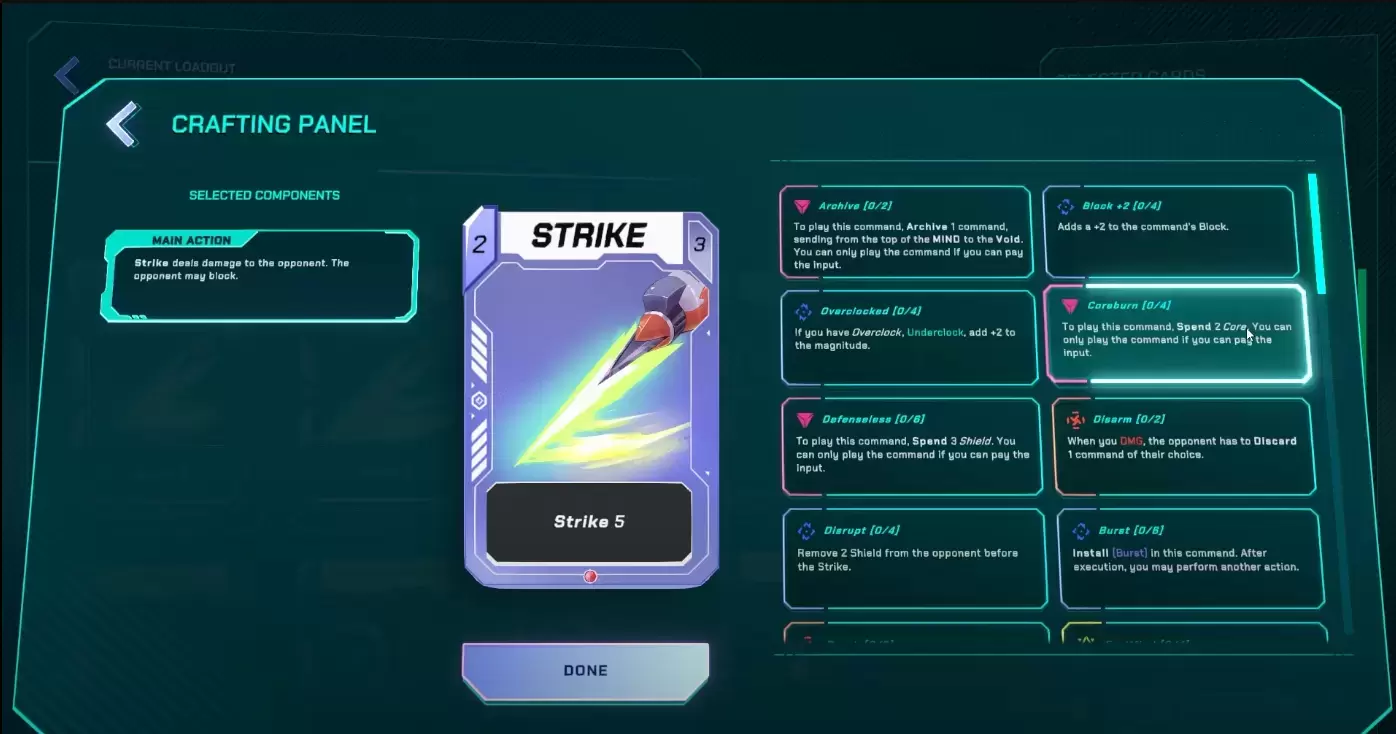 Cada jugador forma su mazo de Cartas de Comando, que representan ataques, defensas y habilidades especiales. Estas cartas pueden ser mejoradas y personalizadas usando Componentes que: