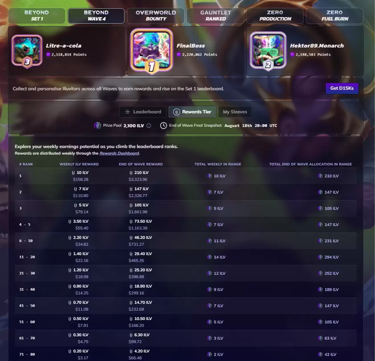 Cada semana, los 100 mejores jugadores de Arena y Overworld reciben $2,300 en $ILV, con tablas de clasificación que se reinician cada jueves.