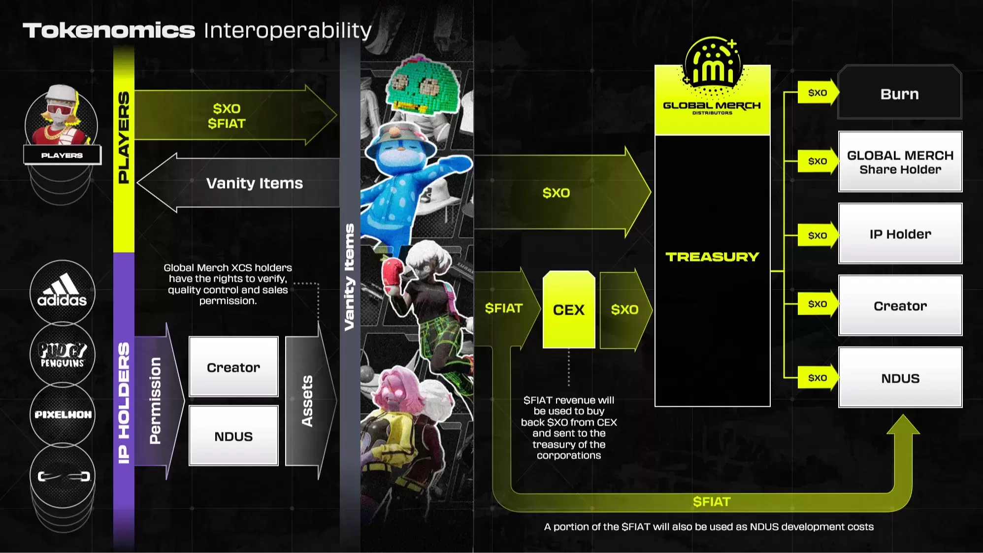 Ejemplo: Los poseedores de Avatares Frontier y Corporate Shares reciben $XO mediante airdrops y staking.