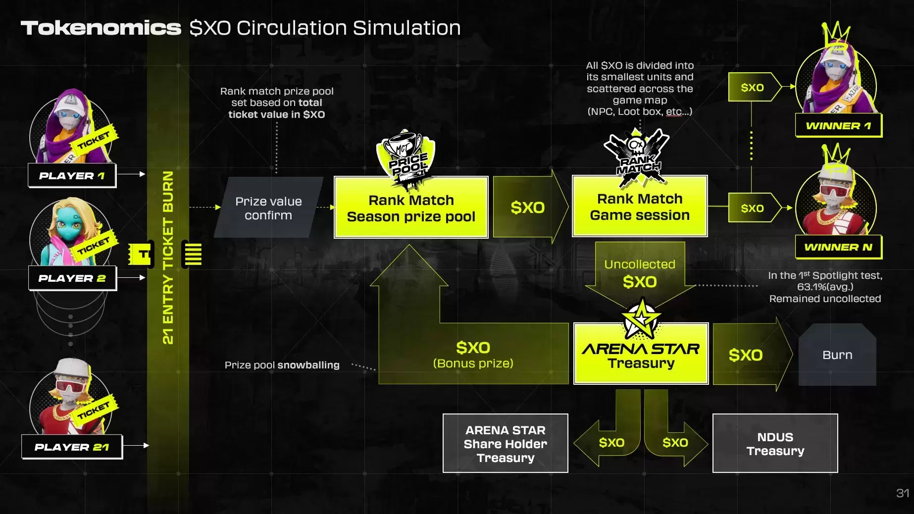 Circulación en el juego Las partidas requieren entradas en $XO o fiat. Las tarifas, junto con subsidios, financian premios de hasta 30x según el rendimiento.