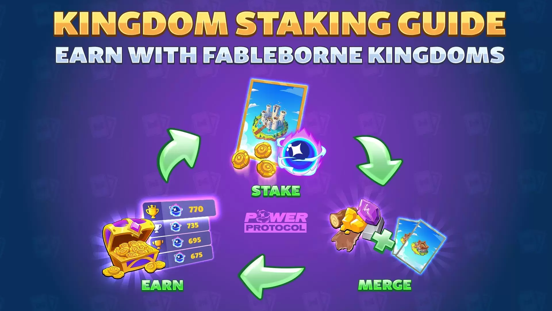 Kingdom Conquest permite ganar $POWER mediante el staking de Kingdom NFTs y el sistema merge-to-mint. Durante cada temporada de staking, los jugadores compiten en rankings para acceder a una parte del pozo de recompensas.