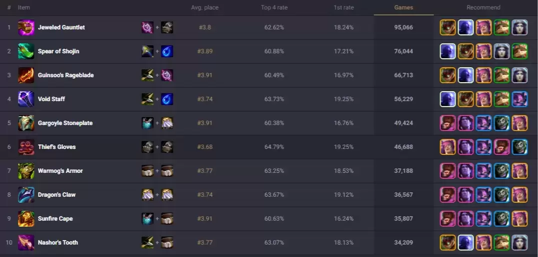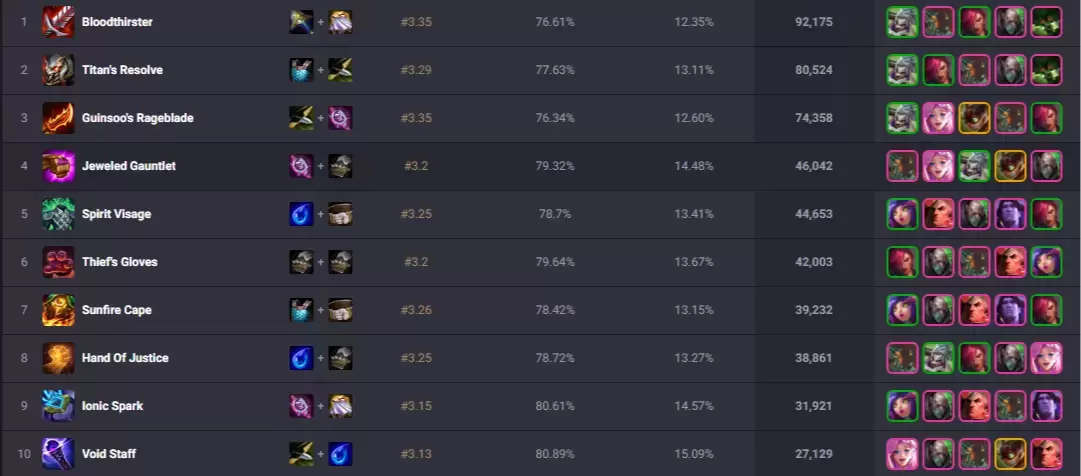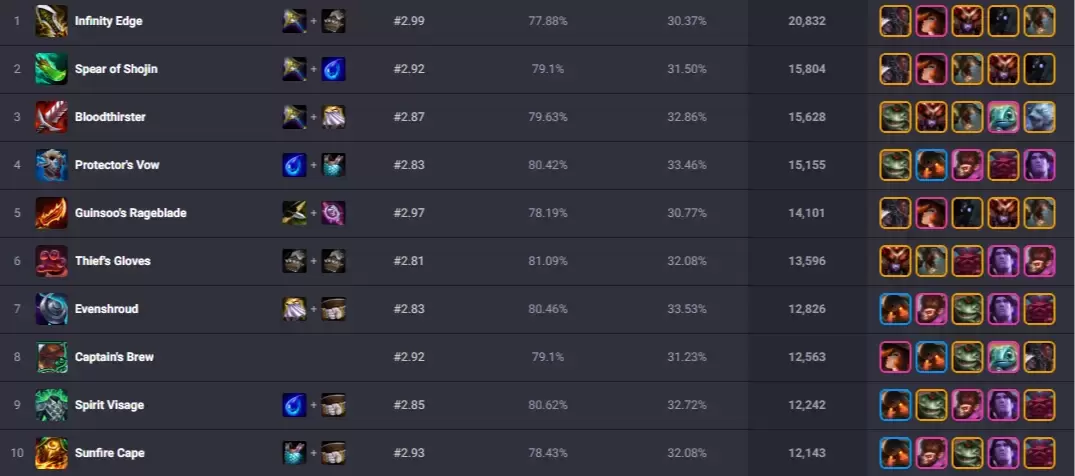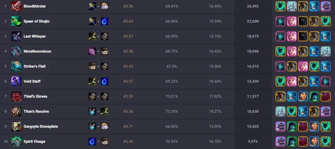 * Kalista: Sus tres objetos esenciales son la Lanza de Shojin, el Último Suspiro y el Mangual (o un objeto de daño crítico) para maximizar su capacidad de limpieza de mesa.
