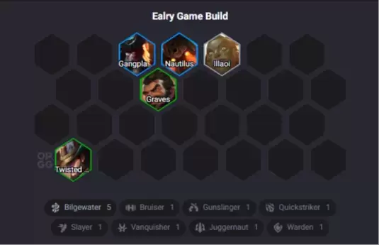 Una composición estándar que depende de conseguir a Twisted Fate en el juego temprano para equiparlo con objetos y empezar a generar "serpientes", las cuales permiten comprar campeones y objetos exclusivos de Aguasturbias. La clave es activar los tres primeros Aguasturbias rápidamente usando a Graves e Illaoi junto a TF.