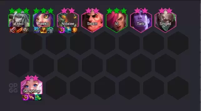 * Línea Frontal: Vi y Neeko proporcionan la resistencia necesaria para que el equipo aguante mientras los carrys escalan. Si se logra subir de nivel después de estabilizar las piezas clave, se añade aNidalee para aumentar el daño generado.