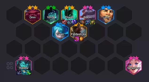 * Juego Tardío: Una vez que aparece Gwen, se le pasan los objetos de Viego, ya que tiene un potencial de combate mucho mayor. Para la defensa, Braum sustituye a los tanques iniciales al ser la pieza más sólida de la composición.