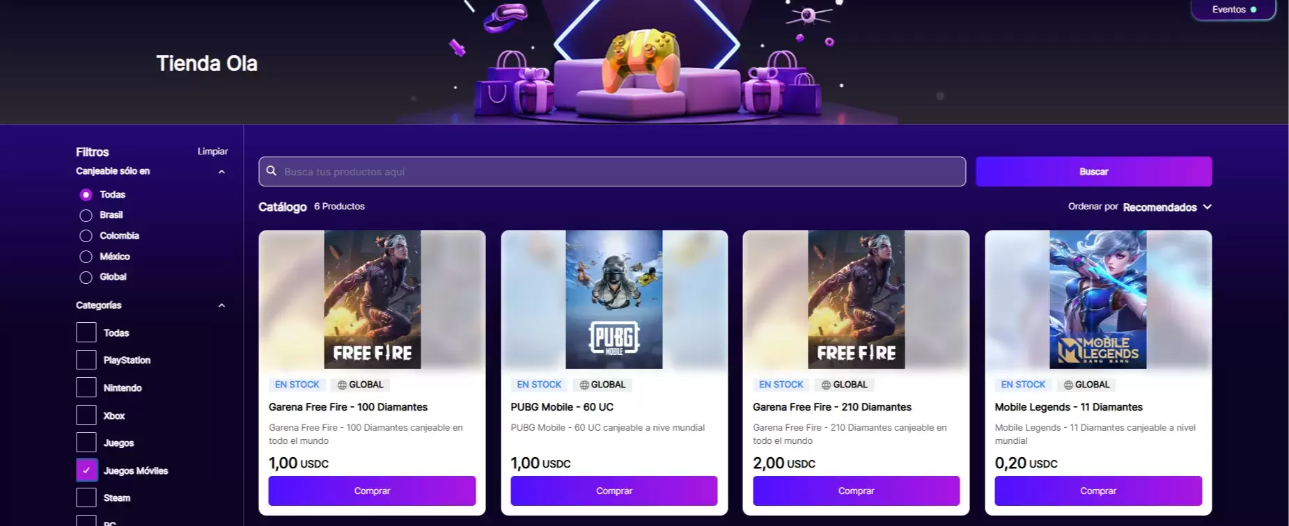 Si deseas adquirir diamantes o recargas de Free Fire, puedes hacerlo directamente desde la tienda de OLA GG, utilizando cualquier token compatible con MetaMask, con descuentos del 10% en compras seleccionadas.