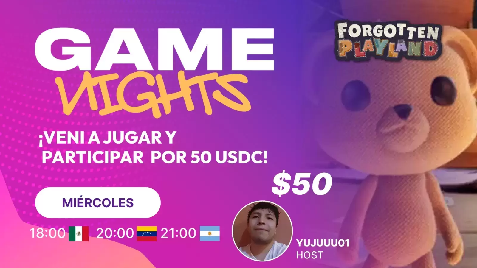 El anfitrión de esta edición será Yujuuu01, conocido por su buena vibra y carisma. Guiará a los participantes durante la noche y coordinará los sorteos, asegurando que todos vivan una experiencia dinámica y entretenida.
