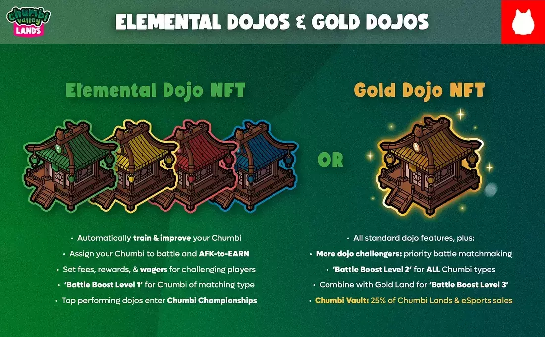 Estos NFT son un extra en el minteo de los cofres de tierra. Los Dojos permiten a los jugadores desafiarse en batallas automáticas, obteniendo recompensas y potenciando su Chumbi. Los Dojos Dorados ofrecen beneficios exclusivos, incluyendo un aumento de estadísticas para cualquier Chumbi y acceso a recompensas en el Chumbi Vault.