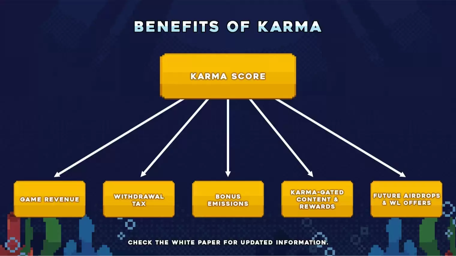 Además, se aplica un impuesto de retiro que varía según el Karma del jugador. Los usuarios con mayor Karma pagan menos impuestos, y lo recaudado se redistribuye entre la comunidad según sus puntajes de Karma.