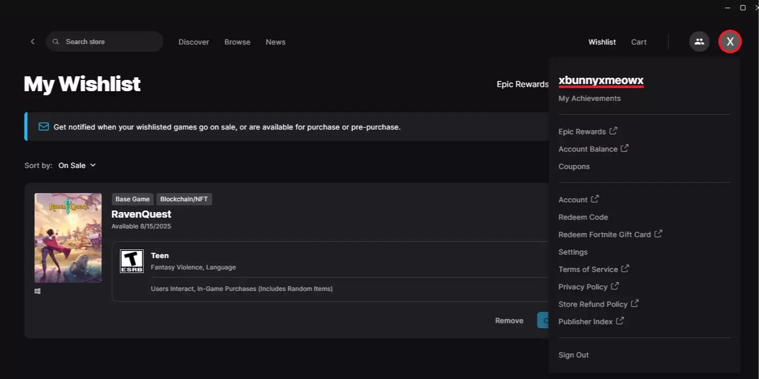 Subir una captura de pantalla que muestre que RavenQuest está en tu lista de deseos y que incluya tu nombre de usuario de Epic.