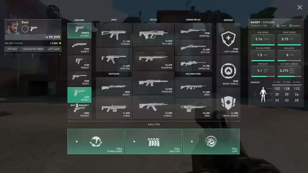 A diferencia de la Ghost, la Bandit puede eliminar de un solo disparo a un rival con escudos ligeros, incluso a larga distancia. Al mismo tiempo, resulta más accesible que la Sheriff, lo que la convierte en una opción intermedia pensada para mantener presión en rondas económicas.