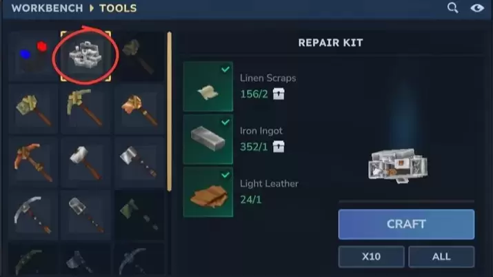 Para reparar cualquier objeto, es necesario contar con un banco de trabajo. Dentro del menú de herramientas aparece un objeto específico llamado Kit de Reparación (Repair Kit).