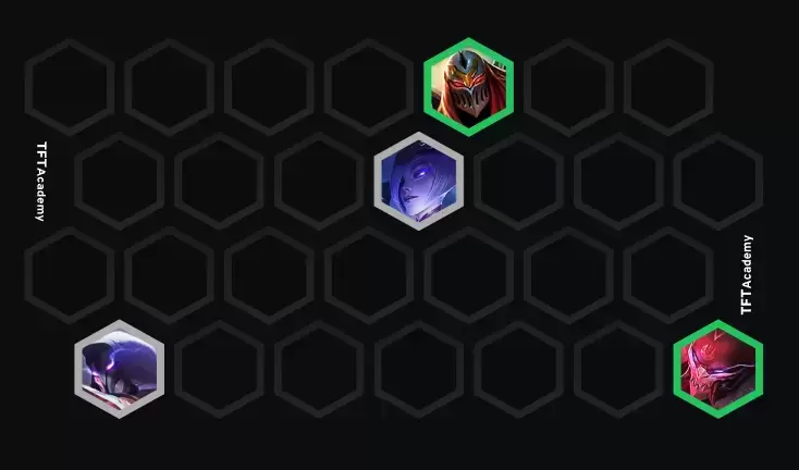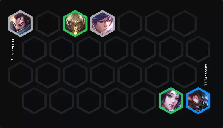 Este set se caracteriza por tener varias composiciones con asesinos que saltan hacia los carries, así que, para cubrir a nuestra Xayah, colocaremos a Tahm Kench y Maokai en la línea trasera, dividiendo a los asesinos y defendiéndola de manera adecuada.