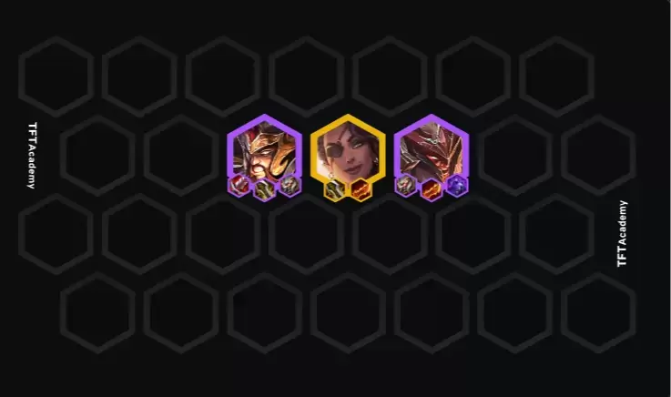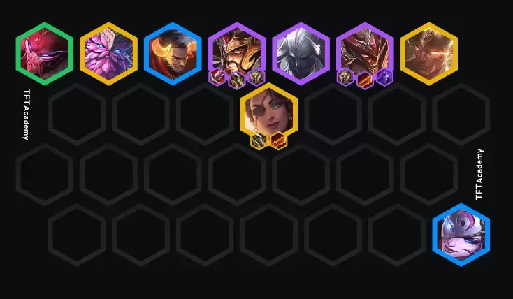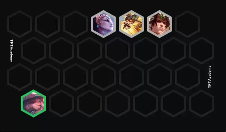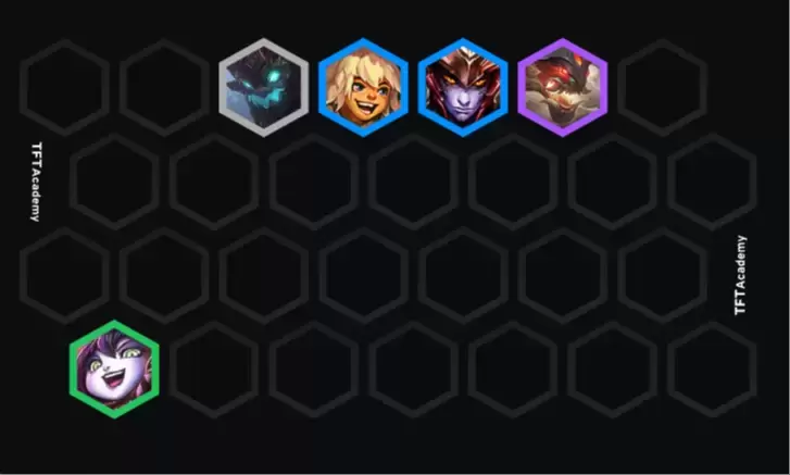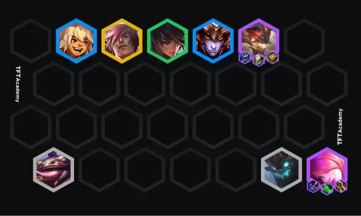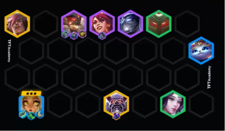 * Transición (Etapa 3): Al llegar a nivel 6, refuerza tu línea frontal con tanques. Si necesitas sobrevivir, fichas fuertes de medio juego como Katarina, Shyvana o Akali pueden portar los objetos temporalmente.