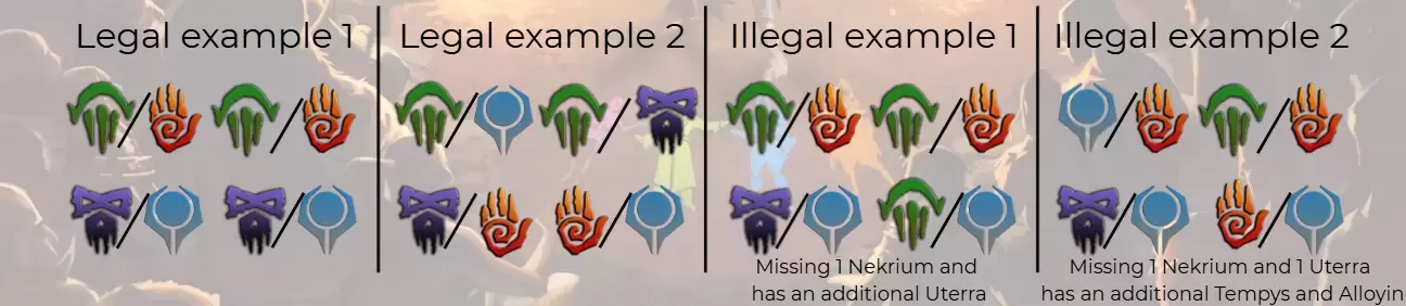Cada jugador debe presentar 4 mazos fusionados (fuses) que incluyan 8 mazos de facciones diferentes, cumpliendo con la siguiente distribución: