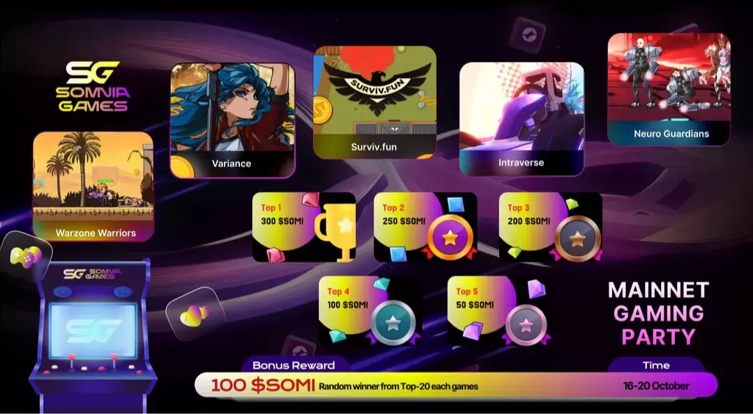 Del 16 al 21 de octubre, Somnia lanza el evento Mainnet Gaming Party (MGP), una celebración de 5 días para marcar el inicio de su red principal con una competencia multijuego. Los jugadores podrán escalar posiciones en los rankings y ganar 5000 $SOMI + recompensas exclusivas dentro de los juegos.