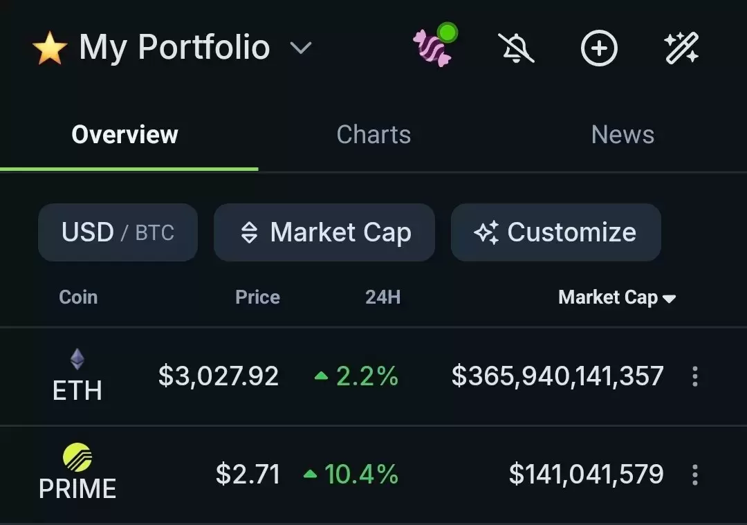 Actualmente, $PRIME se ubica entre las posiciones #390 y #400 del mercado cripto, con una capitalización cercana a los $100 millones de dólares. Su precio ronda los $2.60 USD, aunque ha mostrado variaciones diarias moderadas, con un volumen de transacciones entre $4 y $12 millones en 24 horas, lo que indica una comunidad activa.