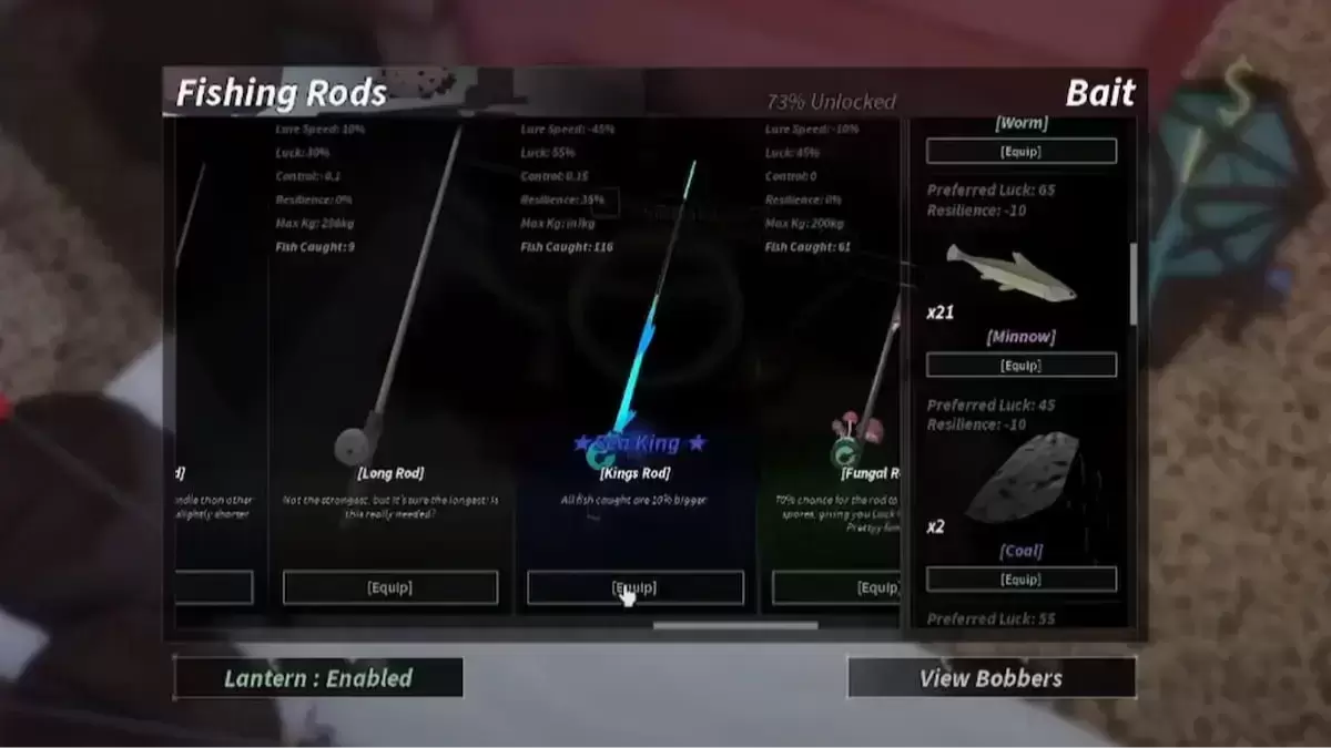 * Minnows: alta suerte preferida, baja resistencia * Shrimp: suerte preferida media, resistencia moderada * Worms: 50% de suerte universal * Flakes: bonificaciones para peces específicos